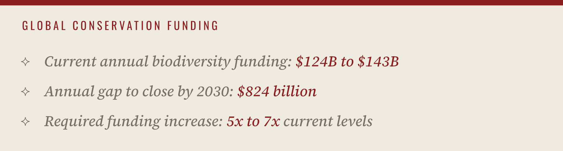 The global economy directs between $124 billion and $143 billion annually to biodiversity funding. The world needs to close an annual financing gap of as much as $824 billion by 2030.