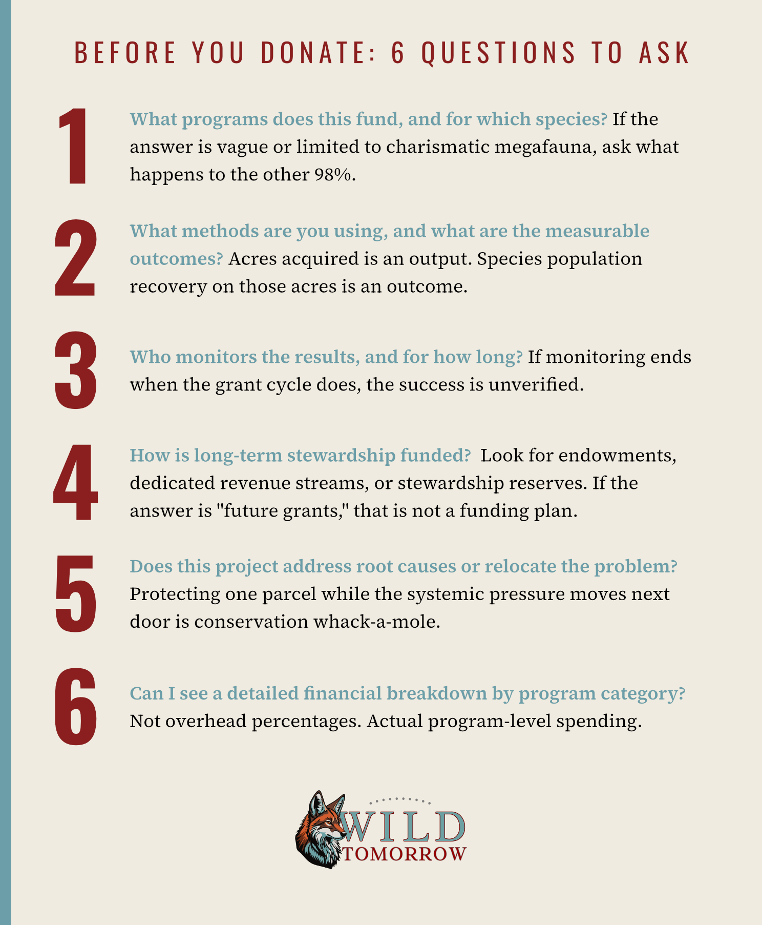 When an organization tells me 90% of donations go to programs, I ask what programs, for which species, using what methods, with what measurable outcomes, monitored by whom, and funded how after the initial grant ends.