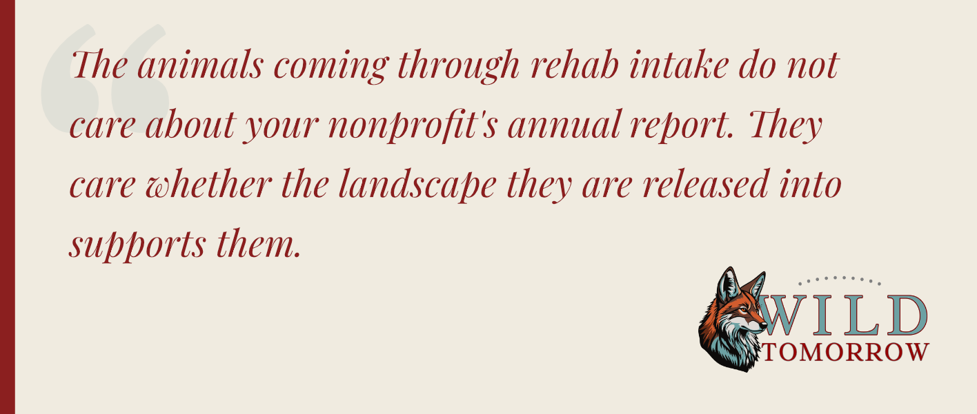 The animals coming through rehab intake do not care about your nonprofit’s annual report. They care whether the landscape they are released into supports them. That is the only metric that matters, and it is the one most donors never see.
